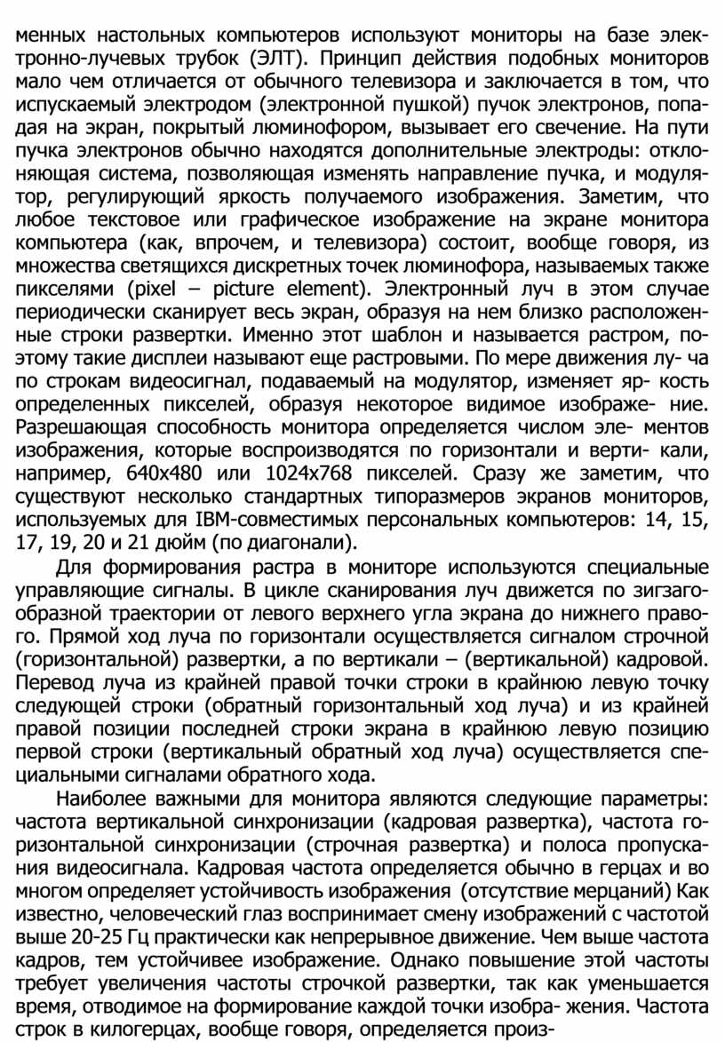 менных настольных компьютеров используют мониторы на базе элек- тронно-лучевых трубок (ЭЛТ). Принцип действия подобных мониторов мало чем отличается от обычного телевизора и заключается в том, что испускаемый электродом (электронной пушкой) пучок электронов, попа- дая на экран, покрытый люминофором, вызывает его свечение. На пути пучка электронов обычно находятся дополнительные электроды: откло- няющая система, позволяющая изменять направление пучка, и модуля- тор, регулирующий яркость получаемого изображения. Заметим, что любое текстовое или графическое изображение на экране монитора компьютера (как, впрочем, и телевизора) состоит, вообще говоря, из множества светящихся дискретных точек люминофора, называемых также пикселями (pixel – picture element). Электронный луч в этом случае периодически сканирует весь экран, образуя на нем близко расположен- ные строки развертки. Именно этот шаблон и называется растром, по- этому такие дисплеи называют еще растровыми. По мере движения лу- ча по строкам видеосигнал, подаваемый на модулятор, изменяет яр- кость определенных пикселей, образуя некоторое видимое изображе- ние. Разрешающая способность монитора определяется числом эле- ментов изображения, которые воспроизводятся по горизонтали и верти- кали, например, 640х480 или 1024х768 пикселей. Сразу же заметим, что существуют несколько стандартных типоразмеров экранов мониторов, используемых для IBM-совместимых персональных компьютеров: 14, 15, 17, 19, 20 и 21 дюйм (по диагонали).