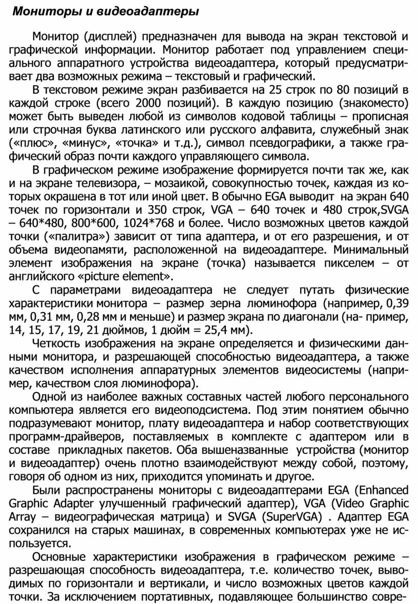 Были распространены мониторы с видеоадаптерами EGA (Enhanced Graphic Adapter улучшенный графический адаптер), VGA (Video Graphic Array – видеографическая матрица) и SVGA (SuperVGA) . Адаптер EGA сохранился на старых машинах, в современных компьютерах уже не ис- пользуется.