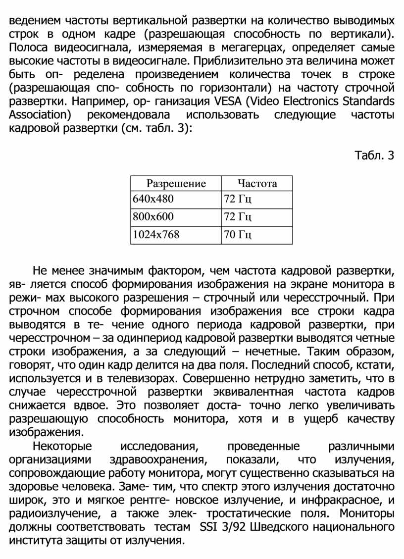 ведением частоты вертикальной развертки на количество выводимых строк в одном кадре (разрешающая способность по вертикали). Полоса видеосигнала, измеряемая в мегагерцах, определяет самые высокие частоты в видеосигнале. Приблизительно эта величина может быть оп- ределена произведением количества точек в строке (разрешающая спо- собность по горизонтали) на частоту строчной развертки. Например, ор- ганизация VESA (Video Electronics Standards Association) рекомендовала использовать следующие частоты кадровой развертки (см. табл. 3):