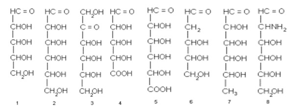 Ko’rib chiqilgan tuzilmalarning har birida bir nechta assimetrik markazlar mavjud va shuning uchun har bir kishi uchun 2 n stereoizomerlari mavjud bo’lishi mumkin, bu erda n – assimetrik markazlar soni. Aldogeksozlarda (2), masalan, ularning 4. Tasniflash maqsadlarida ulardan biri tanlanadi: karbonil guruhidan maksimal darajada olib tashlangan (geksoza uchun C-5) va uning konfiguratsiyasi (D yoki L) monosakaridni D - yoki l-seriyasiga mos ravishda o’z ichiga oladi. Konfiguratsiyani tavsiflash uchun nisbiy konfiguratsiyalarning barcha mumkin bo’lgan birikmalari uchun bir qator ahamiyatsiz nomlar qo’llaniladi. Shunday qilib, D-glyukoza (9), D-galaktoz (10), D-arabinoz (11), l-arabinoz (12), D-riboza (13) va boshqalar.