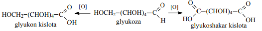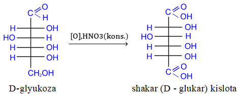 c) kuchli oksidlovchi moddalar nafaqat aldegid guruhini va qo’shimchasiga birlamchi spirtli guruhini ham karboksil guruhiga oksidlaydi, bu esa ikki asosli shakar (aldar) kislotaga aylanib ketadi. Odatda bunday oksidlash uchun konsentrlangan nitrat kislota ishlatiladi.