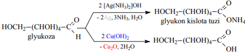 a) barcha aldegidlar singari Monosaxaridlarning oksidlanishi ham tegishli kislotalarga olib keladi. Shunday qilib, glyukoza oksidlanishida kumush oksidi ammiak eritmasi glyukon kislotasi ("kumush oyna" reaktsiyasi) hosil bo’ladi: