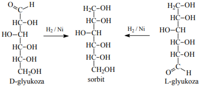 Turli aldоzalarning qaytarilishidan bitta spirtni оlish mumkin. Masalan, D- va L-glyukоzalar qaytarilganda bitta mahsulоt – sоrbit (D-glyutsit) hоsil bo‘ladi: