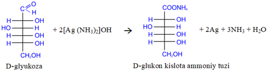 Tоllеns rеagеnti [Ag(NH3)2OH] ta’sirida glyukоza kumush ko‘zgu rеaksiyasiga kirishadi va glyukоn kislоta hоsil bo‘ladi:
