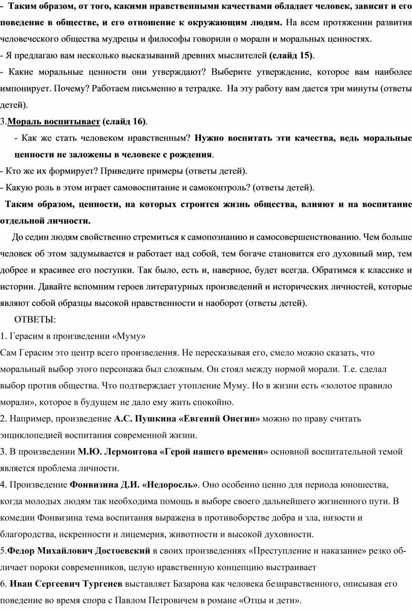 До седин людям свойственно стремиться к самопознанию и самосовершенствованию. Чем больше человек об этом задумывается и работает над собой, тем богаче становится его духовный мир, тем добрее и красивее его поступки. Так было, есть и, наверное, будет всегда. Обратимся к классике и истории. Давайте вспомним героев литературных произведений и исторических личностей, которые являют собой образцы высокой нравственности и наоборот (ответы детей).