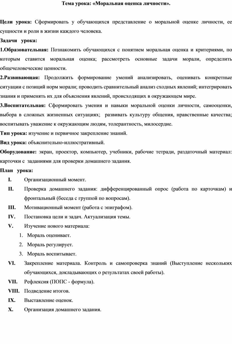 Цели урока: Сформировать у обучающихся представление о моральной оценке личности, ее сущности и роли в жизни каждого человека.