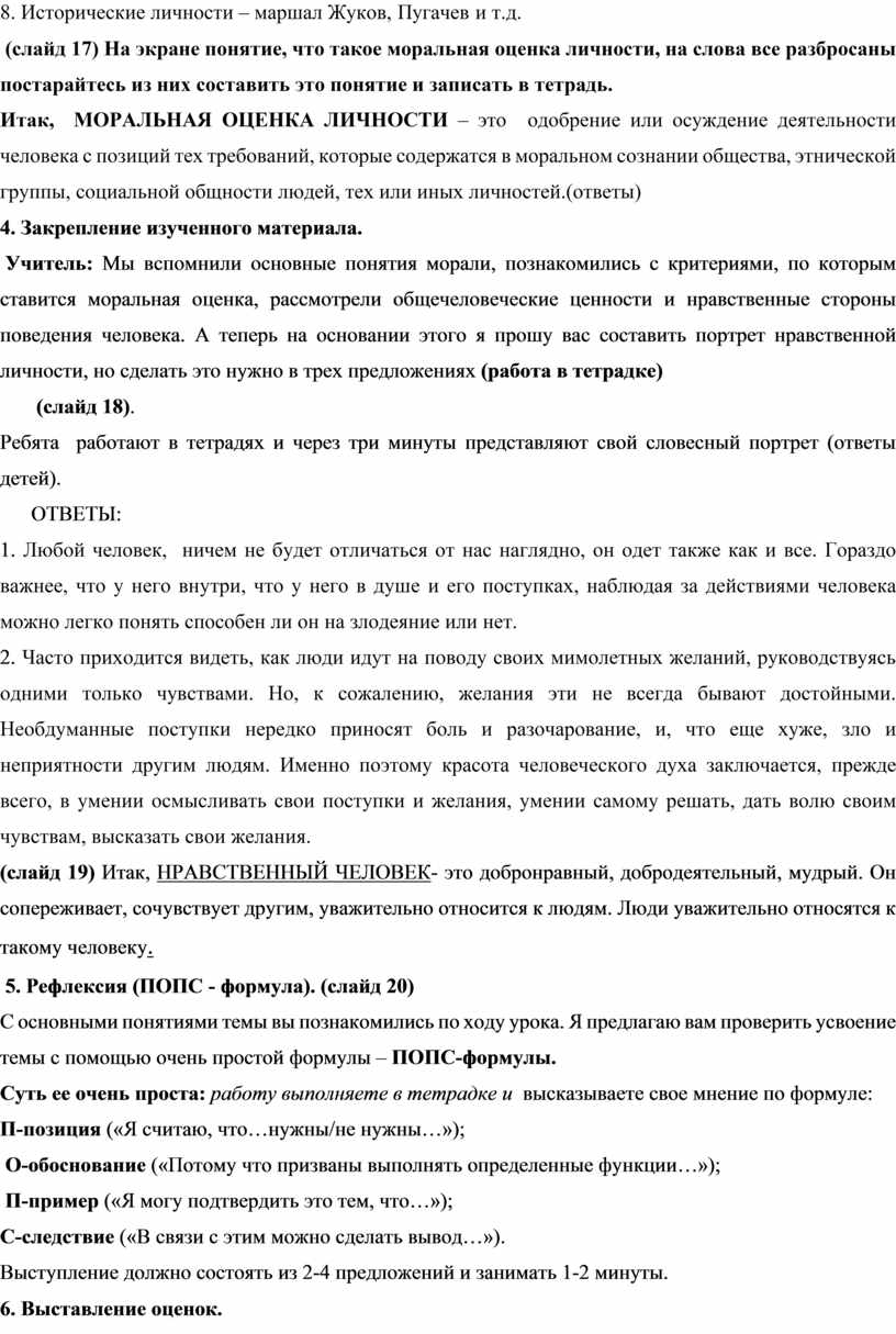Итак, МОРАЛЬНАЯ ОЦЕНКА ЛИЧНОСТИ – это одобрение или осуждение деятельности человека с позиций тех требований, которые содержатся в моральном сознании общества, этнической группы, социальной общности людей, тех или иных личностей.(ответы)