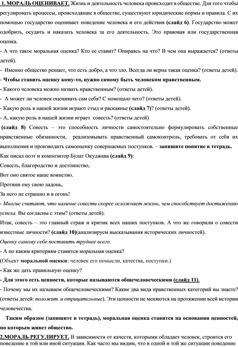 - А что такое моральная оценка? Кто ее ставит? Опираясь на что? В чем она выражается? (ответы детей).