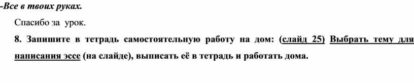 8. Запишите в тетрадь самостоятельную работу на дом: (слайд 25) Выбрать тему для написания эссе (на слайде), выписать её в тетрадь и работать дома.