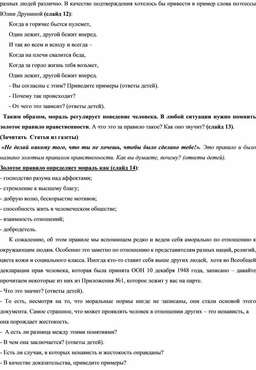 Таким образом, мораль регулирует поведение человека. В любой ситуации нужно помнить золотое правило нравственности. А что это за правило такое? Как оно звучит? (слайд 13).