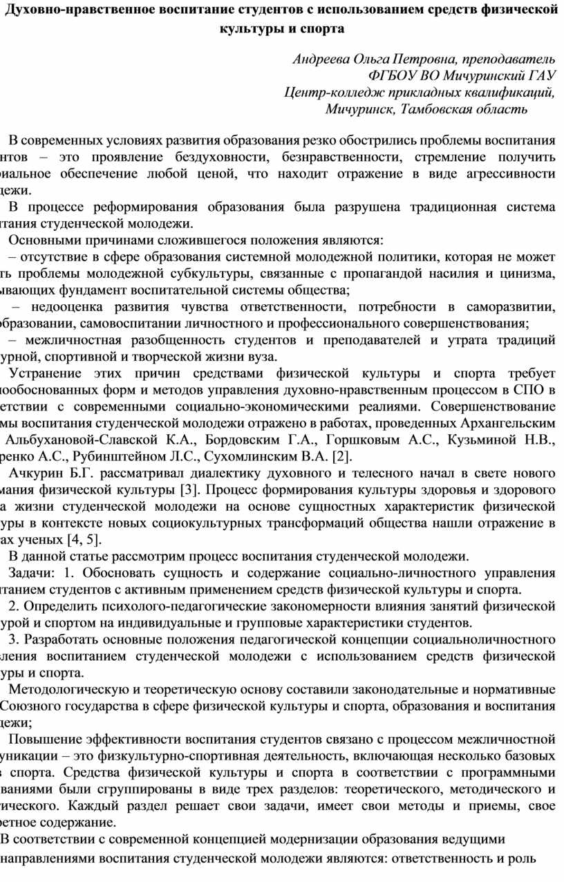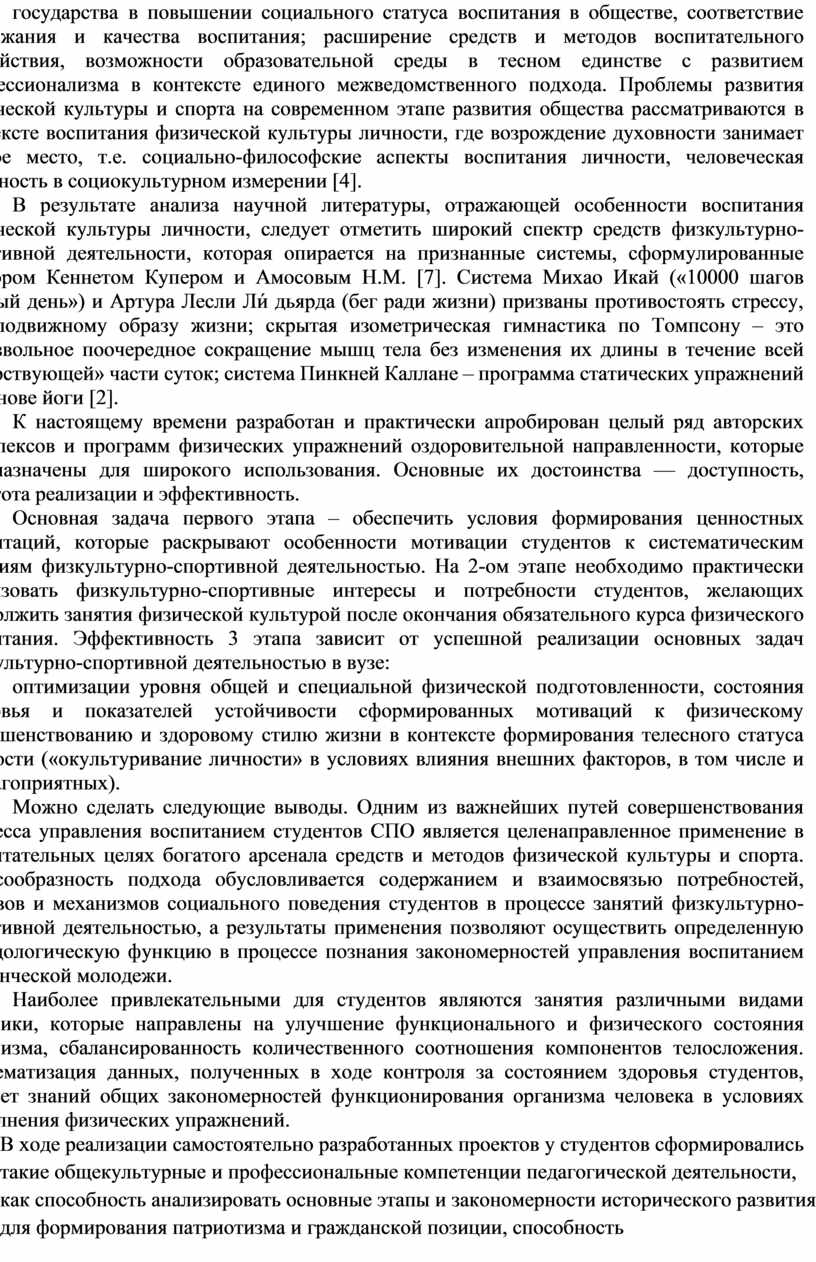 Устранение этих причин средствами физической культуры и спорта требует научнообоснованных форм и методов управления духовно-нравственным процессом в СПО в соответствии с современными социально-экономическими реалиями. Совершенствование системы воспитания студенческой молодежи отражено в работах, проведенных Архангельским С.И., Альбухановой-Славской К.А., Бордовским Г.А., Горшковым А.С., Кузьминой Н.В., Макаренко А.С., Рубинштейном Л.С., Сухомлинским В.А. [2].