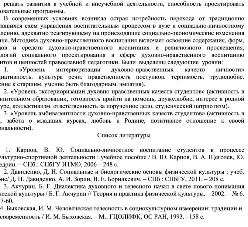 1. Карпов, В. Ю. Социально-личностное воспитание студентов в процессе физкультурно-спортивной деятельности : учебное пособие / В. Ю. Карпов, В. А. Щеголев, Ю. Н. Щедрин. – СПб.: СПбГУ ИТМО, 2006 – 248 с.