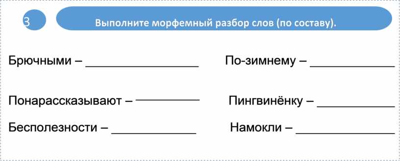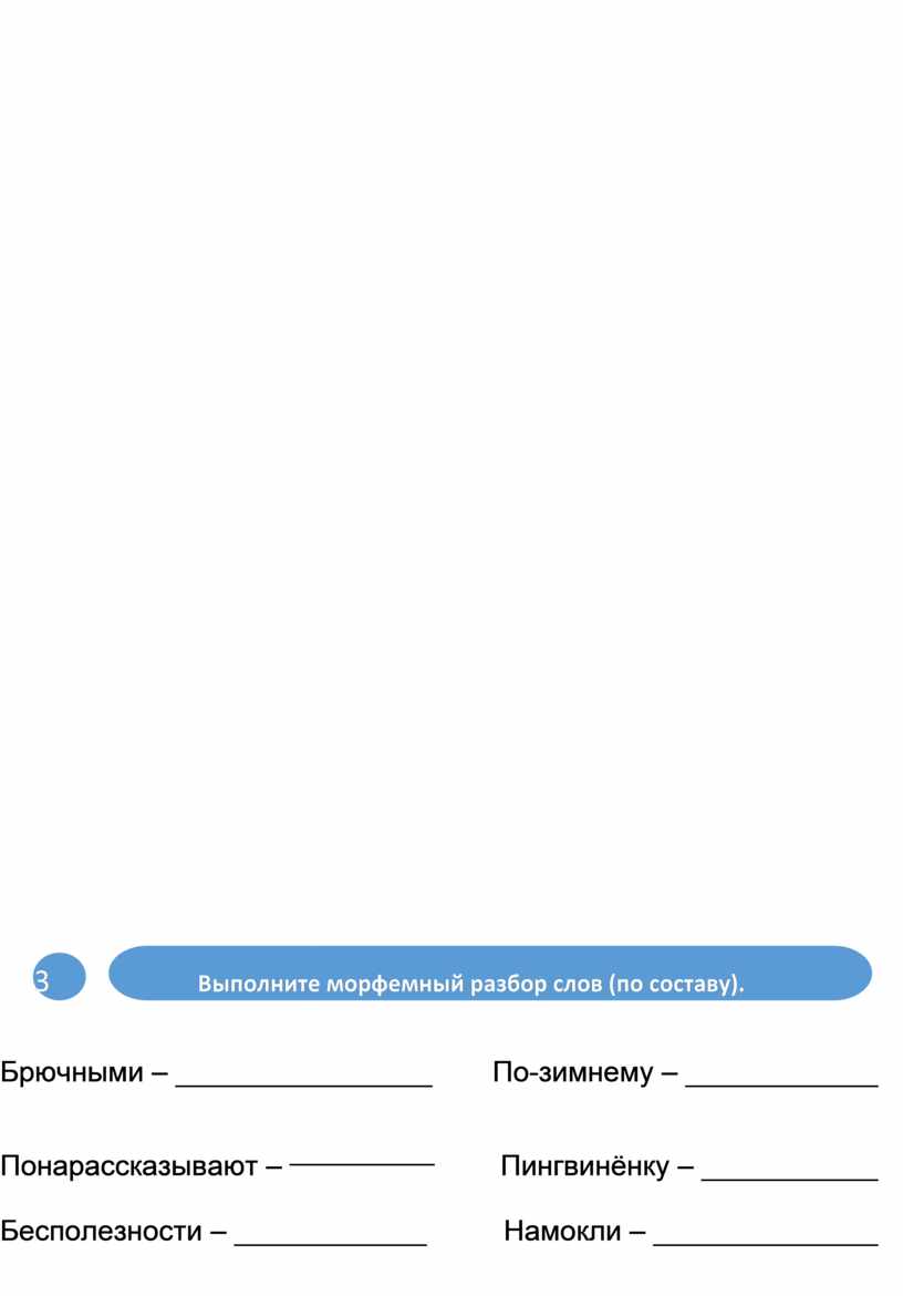 Брючными – ________________ По-зимнему – ____________ Понарассказывают – _________ Пингвинёнку – ___________ Бесполезности – ____________ Намокли – ______________ Приморскими – ______________ Замечая – _______________ |