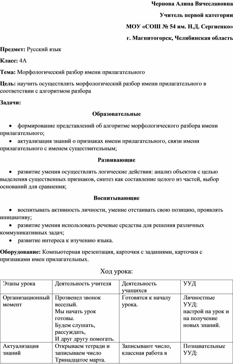 Цель: научить осуществлять морфологический разбор имени прилагательного в соответствии с алгоритмом разбора