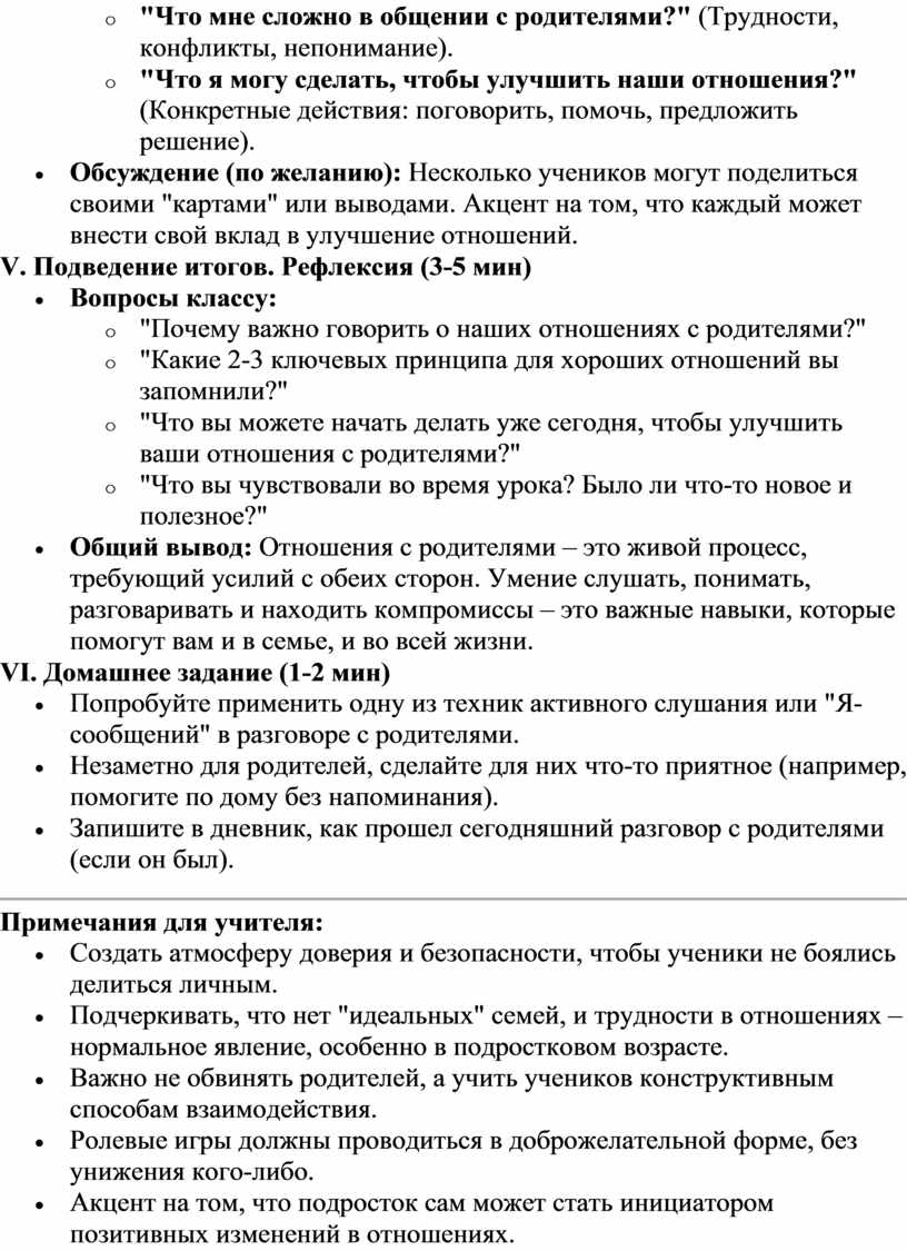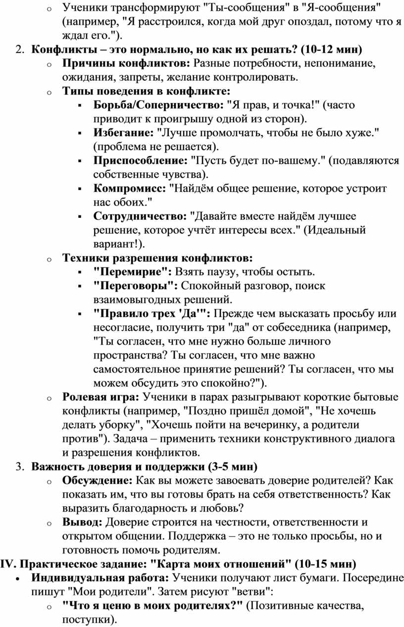 o Ролевая игра: Ученики в парах разыгрывают короткие бытовые конфликты (например, "Поздно пришёл домой", "Не хочешь делать уборку", "Хочешь пойти на вечеринку, а родители против"). Задача – применить техники конструктивного диалога и разрешения конфликтов.