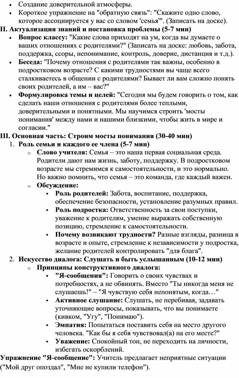 Конспект урока: "Мосты понимания: учимся строить отношения с родителями"