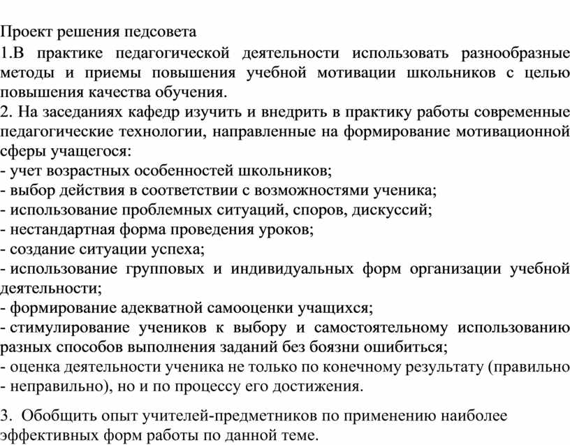 2. На заседаниях кафедр изучить и внедрить в практику работы современные педагогические технологии, направленные на формирование мотивационной сферы учащегося:
