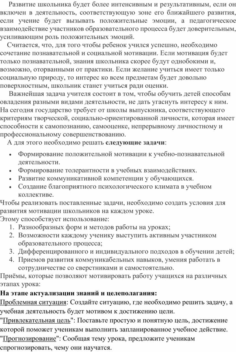 Одной из задач, которая должна решаться в школе, является создание условий для формирования положительной учебной мотивации и дальнейшее её развитие у школьников.