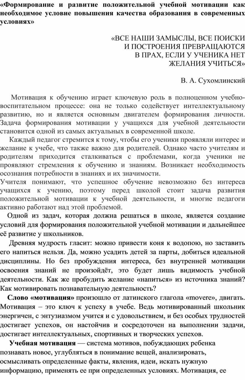 «Формирование и развитие положительной учебной мотивации как необходимое условие повышения качества образования в современных условиях»