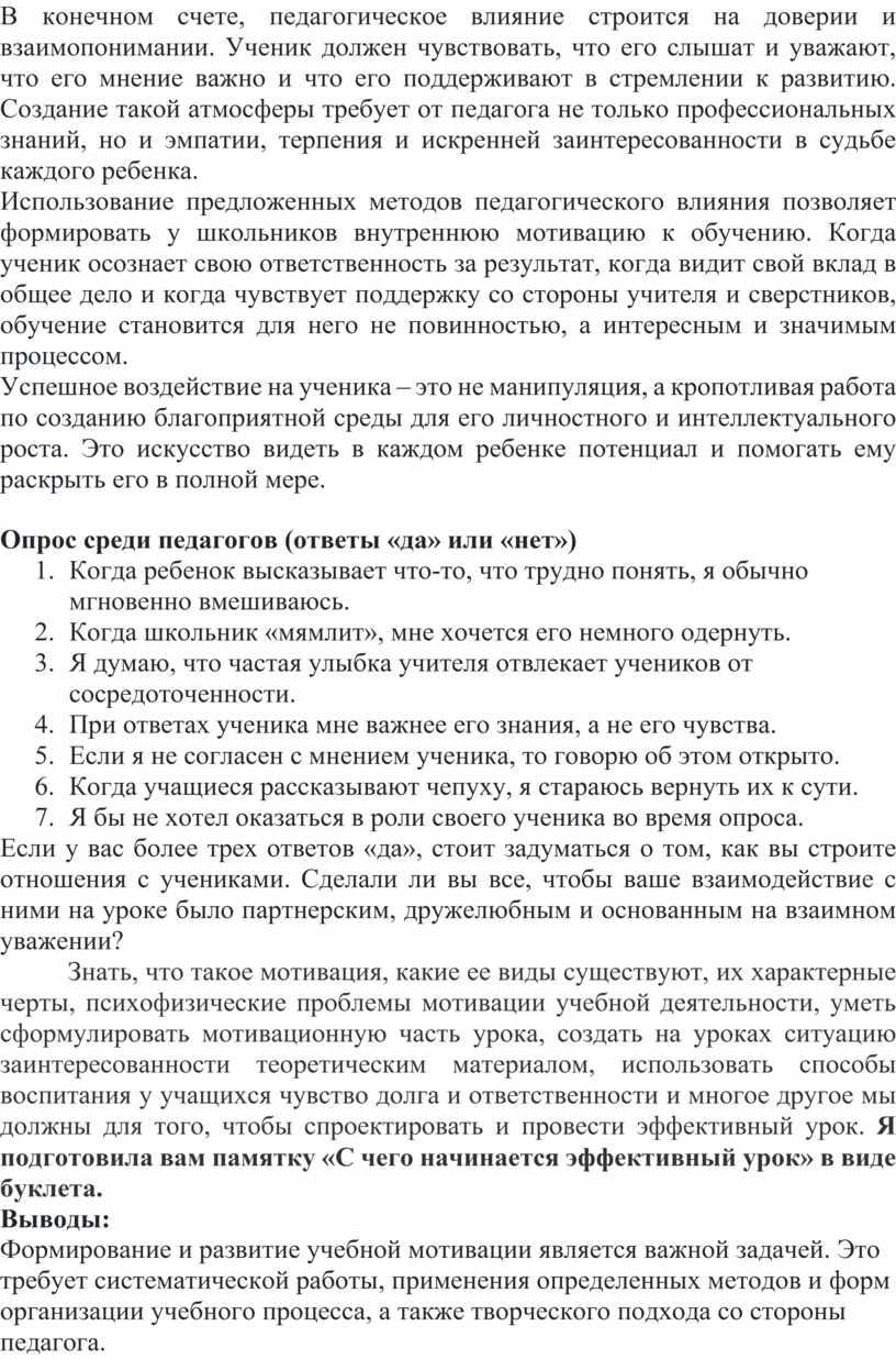 Знать, что такое мотивация, какие ее виды существуют, их характерные черты, психофизические проблемы мотивации учебной деятельности, уметь сформулировать мотивационную часть урока, создать на уроках ситуацию заинтересованности теоретическим материалом, использовать способы воспитания у учащихся чувство долга и ответственности и многое другое мы должны для того, чтобы спроектировать и провести эффективный урок. Я подготовила вам памятку «С чего начинается эффективный урок» в виде буклета.