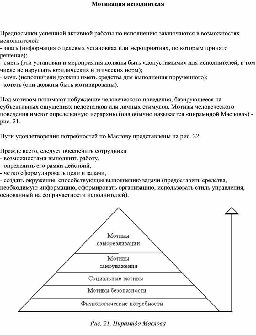 Под мотивом понимают побуждение человеческого поведения, базирующееся на субъективных ощущениях недостатков или личных стимулов. Мотивы человеческого поведения имеют определенную иерархию (она обычно называется «пирамидой Маслова») - рис. 21.