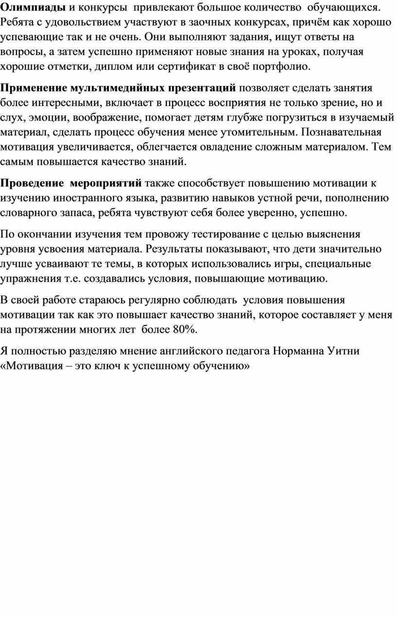 Я полностью разделяю мнение английского педагога Норманна Уитни «Мотивация – это ключ к успешному обучению»