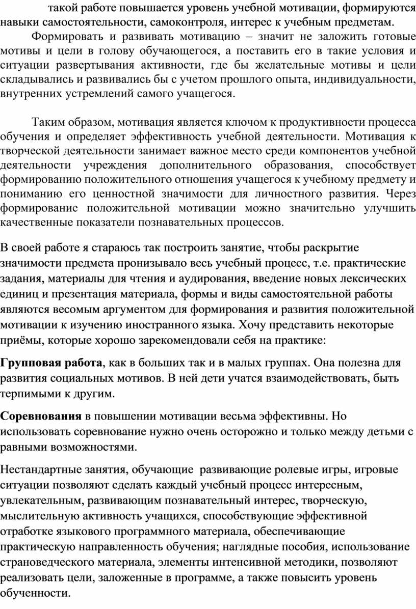 Таким образом, мотивация является ключом к продуктивности процесса обучения и определяет эффективность учебной деятельности. Мотивация к творческой деятельности занимает важное место среди компонентов учебной деятельности учреждения дополнительного образования, способствует формированию положительного отношения учащегося к учебному предмету и пониманию его ценностной значимости для личностного развития. Через формирование положительной мотивации можно значительно улучшить качественные показатели познавательных процессов.