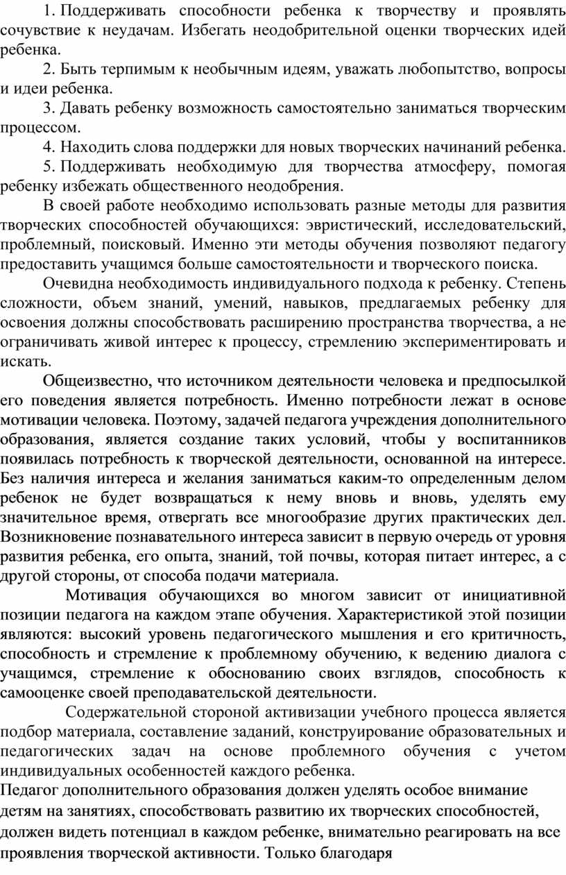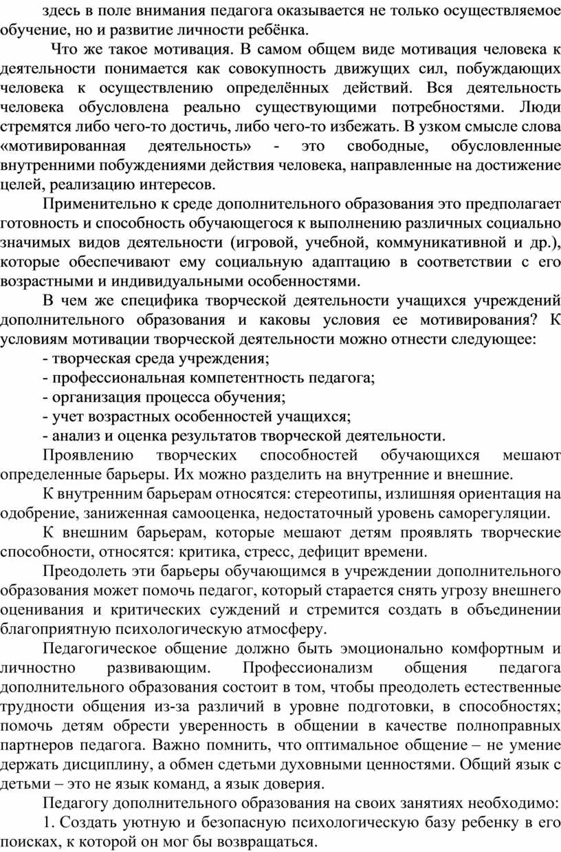 Педагог дополнительного образования должен уделять особое внимание детям на занятиях, способствовать развитию их творческих способностей, должен видеть потенциал в каждом ребенке, внимательно реагировать на все проявления творческой активности. Только благодаря такой работе повышается уровень учебной мотивации, формируются навыки самостоятельности, самоконтроля, интерес к учебным предметам.