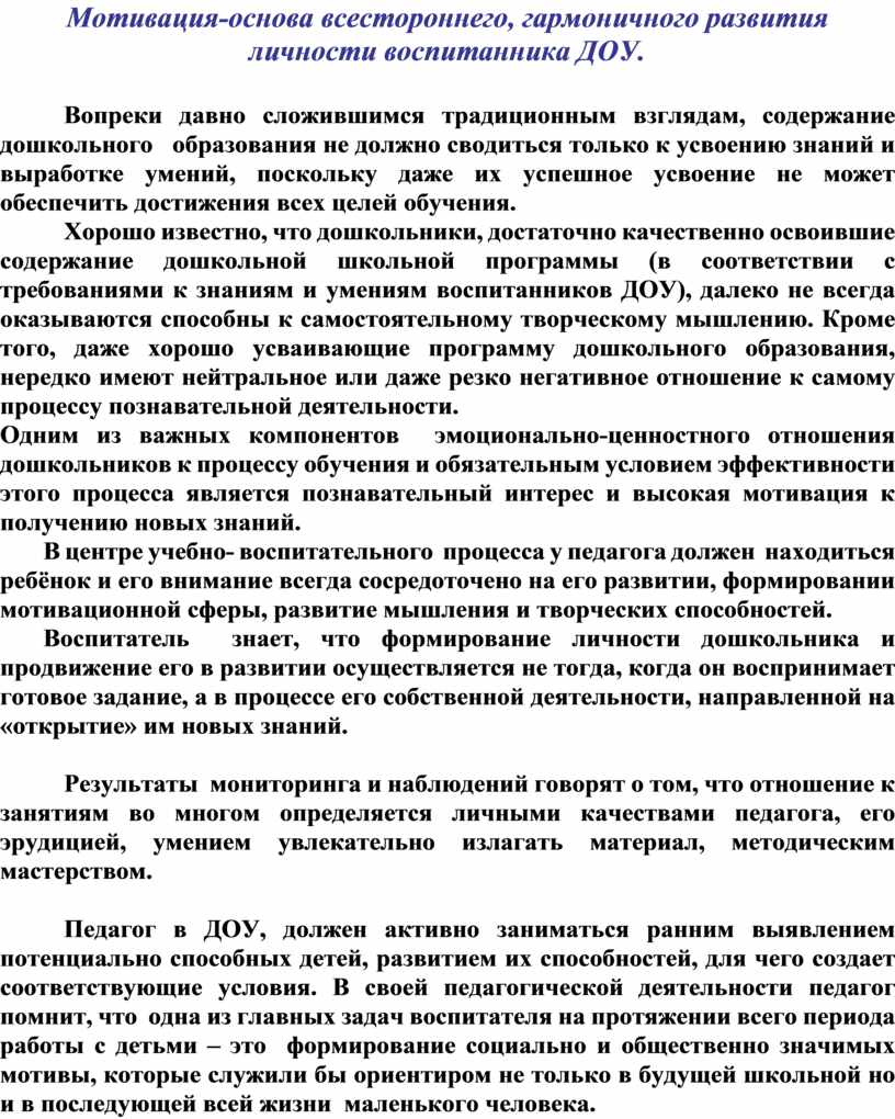 Мотивация-основа всестороннего, гармоничного развития личности воспитанника ДОУ.