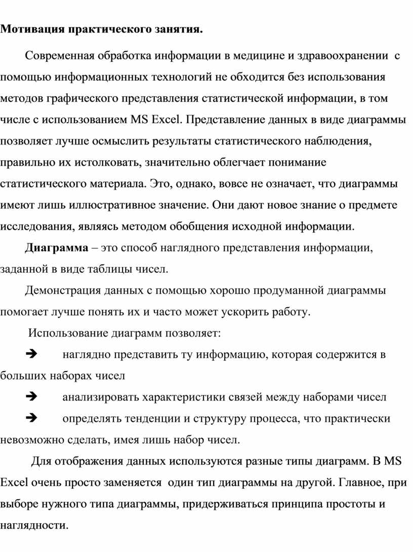 Современная обработка информации в медицине и здравоохранении с помощью информационных технологий не обходится без использования методов графического представления статистической информации, в том числе с использованием MS Excel. Представление данных в виде диаграммы позволяет лучше осмыслить результаты статистического наблюдения, правильно их истолковать, значительно облегчает понимание статистического материала. Это, однако, вовсе не означает, что диаграммы имеют лишь иллюстративное значение. Они дают новое знание о предмете исследования, являясь методом обобщения исходной информации.