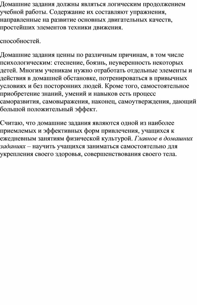 Выполнение домашних заданий по физической культуре, как и по любому другому предмету, - органическая часть учебного процесса..