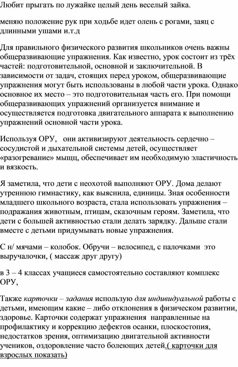 - выполнение общеразвивающих упражнений не по общему подсчёту учителя «раз, два, три, четыре…», а самостоятельно в индивидуальном темпе по карточкам,
