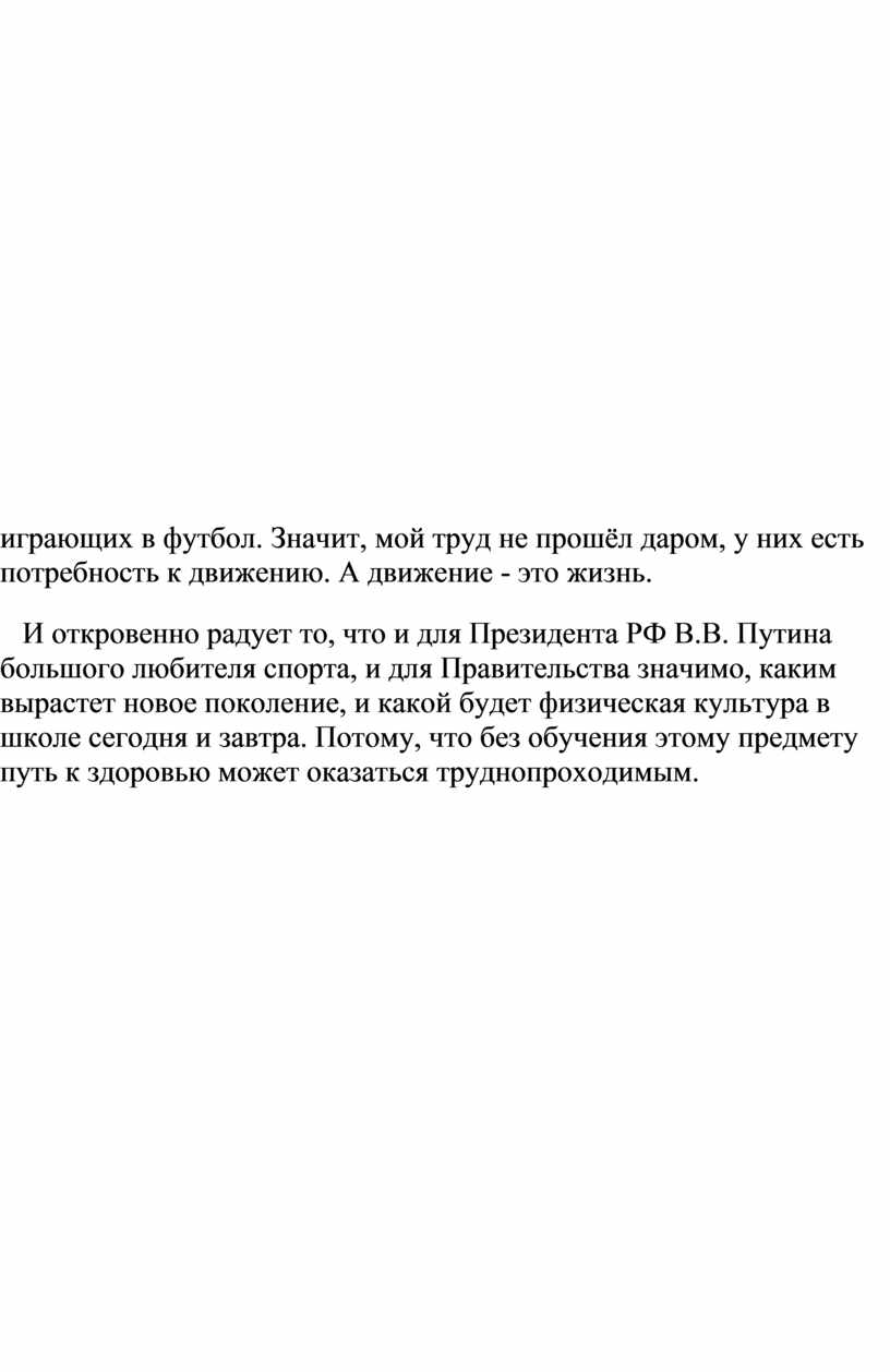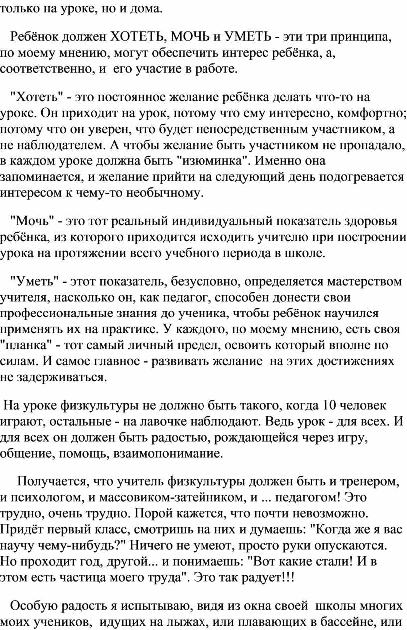 «Моя философия - А ЧЕМУ УЧИТ ФИЗИЧЕСКАЯ КУЛЬТУРА?» Каждый учебный предмет решает свою специфическую задачу. Так русский язык обеспечивает овладение умением писать, литература - читать, разбираться в прочитанном, математика - считать. А ЧЕМУ УЧИТ ФИЗИЧЕСКАЯ КУЛЬТУРА? Она должна, по моему мнению, учить искусству, быть здоровым, вести здоровый образ жизни. В нашей работе, работе учителя физкультуры, надо исходить из интереса и потребности ребёнка, которому с рождения нужно двигаться, резвиться, падать, кричать и быть, быть здоровым! В школу дети ходят ради получения знаний, а на уроки физкультуры - ради укрепления здоровья и физического развития, и надо это в первую очередь не учителю, а именно им. А что в реальности? Болеют дети всё больше и больше. Здоровье нации падает и падает. Оно деградирует. А чем всегда был силён и могуч русский народ? Здоровьем и силой духа! Победа в Отечественной войне 1812 года, победа в Великой Отечественной войне 1941-1945 гг. - это победы здорового, закалённого душой и телом народа. Так что же делать? Да просто не сидеть, сложа руки. Надо с первых уроков, детей в школе учить их трудиться. Человек рождается на свет, вместе с ним рождается лень, и всю свою жизнь человек борется со своей ленью. Ведь правильно звучит цитата из известной детской книжки "Мишка - топтыжка": "Если хочешь чему-то научиться, надо очень сильно захотеть и немножко попотеть!" Как же сделать так, чтобы ребёнок трудился, не принуждая его к этому? Вот в чём проблема. Я думаю, всё напрямую зависит от учителя, от его желания и умения. Ведь физическая культура - это урок, на котором, как ни на одном другом, учащиеся могут отследить реальные результаты своего развития. на своих уроках часто повторяю: "Нет учеников неспособных, а есть трудолюбивые и ленивые", - и поэтому прилагаю максимум усилий, чтобы заинтересовать, убедить, научить каждого ученика трудиться не только на уроке, но и дома. Ребёнок должен ХОТЕТЬ, МОЧЬ и УМЕТЬ - эти три принципа, по моему мнению, могут обеспечить интерес ребёнка, а, соответственно, и его участие в работе. "Хотеть" - это постоянное желание ребёнка делать что-то на уроке. Он приходит на урок, потому что ему интересно, комфортно; потому что он уверен, что будет непосредственным участником, а не наблюдателем. А чтобы желание быть участником не пропадало, в каждом уроке должна быть "изюминка". Именно она запоминается, и желание прийти на следующий день подогревается интересом к чему-то необычному. "Мочь" - это тот реальный индивидуальный показатель здоровья ребёнка, из которого приходится исходить учителю при построении урока на протяжении всего учебного периода в школе. "Уметь" - этот показатель, безусловно, определяется мастерством учителя, насколько он, как педагог, способен донести свои профессиональные знания до ученика, чтобы ребёнок научился применять их на практике. У каждого, по моему мнению, есть своя "планка" - тот самый личный предел, освоить который вполне по силам. И самое главное - развивать желание на этих достижениях не задерживаться. На уроке физкультуры не должно быть такого, когда 10 человек играют, остальные - на лавочке наблюдают. Ведь урок - для всех. И для всех он должен быть радостью, рождающейся через игру, общение, помощь, взаимопонимание. Получается, что учитель физкультуры должен быть и тренером, и психологом, и массовиком-
