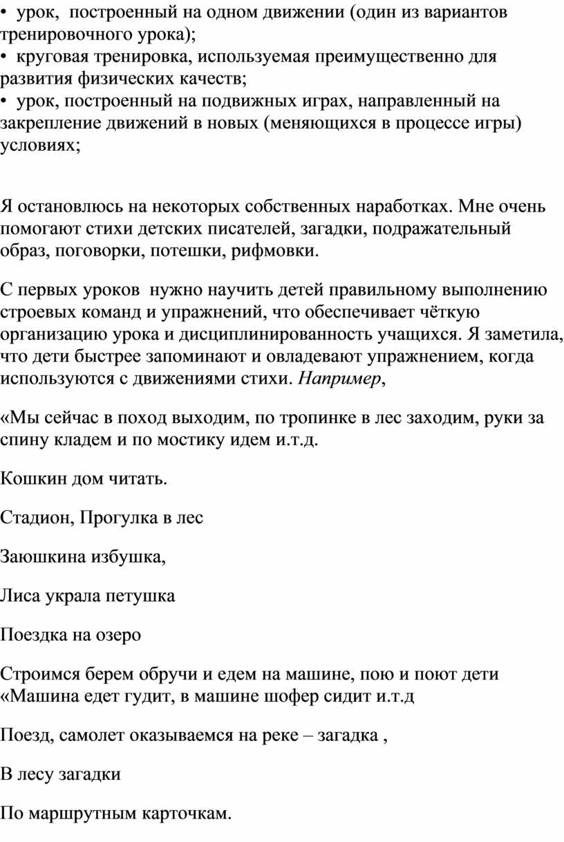 • урок-путешествие, построенный, как правило, на сказочной или реальной основе, где содержание двигательной деятельности согласуется с сюжетом (маршрутом путешествия);