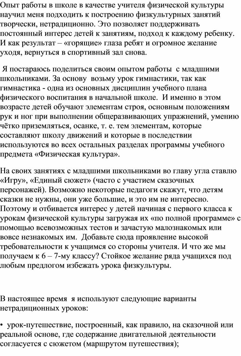 Опыт работы в школе в качестве учителя физической культуры научил меня подходить к построению физкультурных занятий творчески, нетрадиционно. Это позволяет поддерживать постоянный интерес детей к занятиям, подход к каждому ребенку. И как результат – «горящие» глаза ребят и огромное желание уходя, вернуться в спортивный зал снова.
