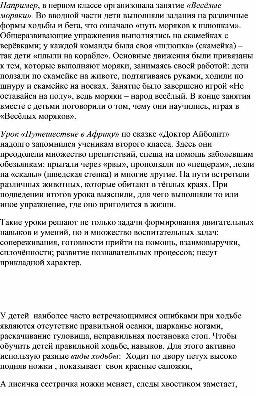 Например, в первом классе организовала занятие «Весёлые моряки». Во вводной части дети выполняли задания на различные формы ходьбы и бега, что означало «путь моряков к шлюпкам». Общеразвивающие упражнения выполнялись на скамейках с верёвками; у каждой команды была своя «шлюпка» (скамейка) – так дети «плыли на корабле». Основные движения были привязаны к тем, которые выполняют моряки, занимаясь своей работой: дети ползали по скамейке на животе, подтягиваясь руками, ходили по шнуру и скамейке на носках. Занятие было завершено игрой «Не оставайся на полу», ведь моряки – народ весёлый. В конце занятия вместе с детьми поговорили о том, чему они научились, играя в «Весёлых моряков».