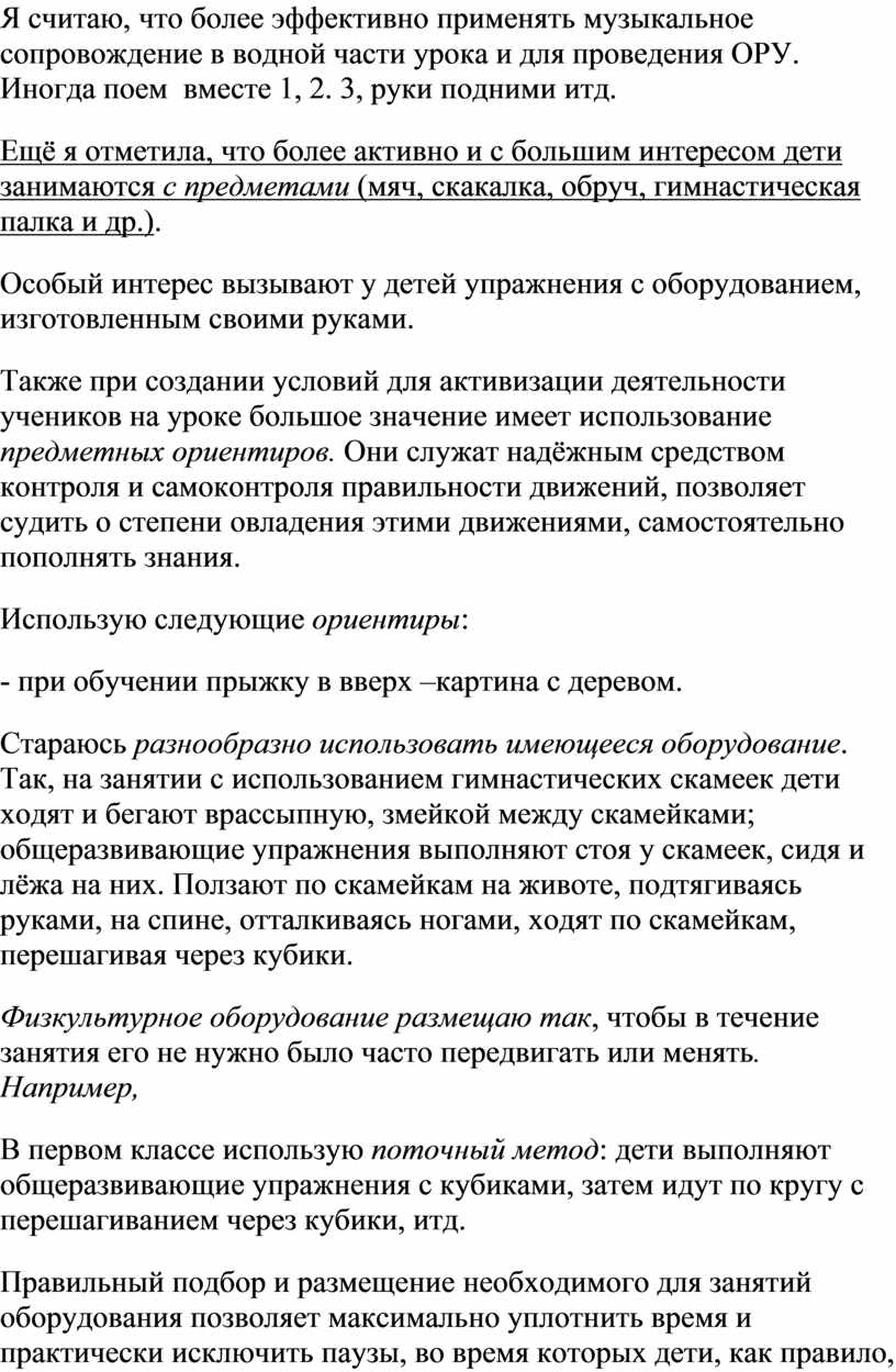 Я постараюсь поделиться своим опытом работы с младшими школьниками. За основу возьму урок гимнастики, так как гимнастика - одна из основных дисциплин учебного плана физического воспитания в начальной школе. И именно в этом возрасте детей обучают элементам строя, основным положениям рук и ног при выполнении общеразвивающих упражнений, умению чётко приземляться, осанке, т. е. тем элементам, которые составляют школу движений и которые в последствии используются во всех остальных разделах программы учебного предмета «Физическая культура».