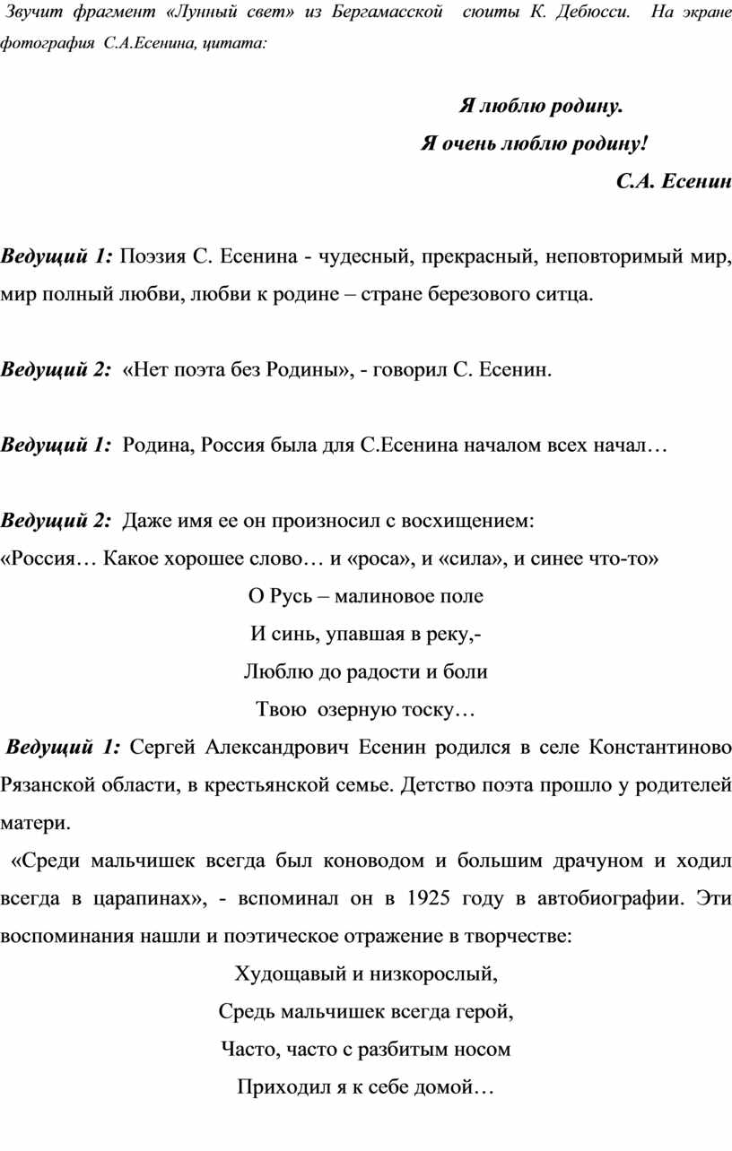 Звучит фрагмент «Лунный свет» из Бергамасской сюиты К. Дебюсси. На экране фотография С.А.Есенина, цитата: