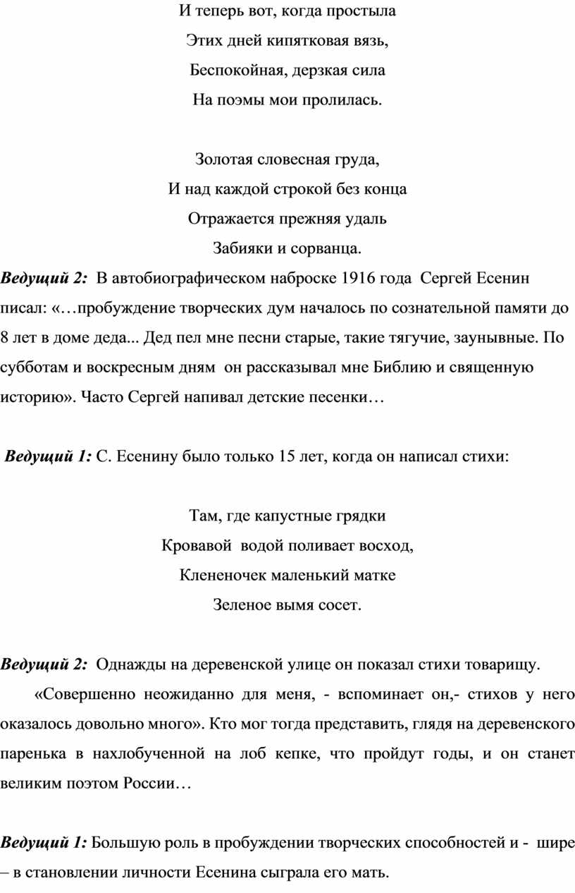 Ведущий 1: С. Есенину было только 15 лет, когда он написал стихи: