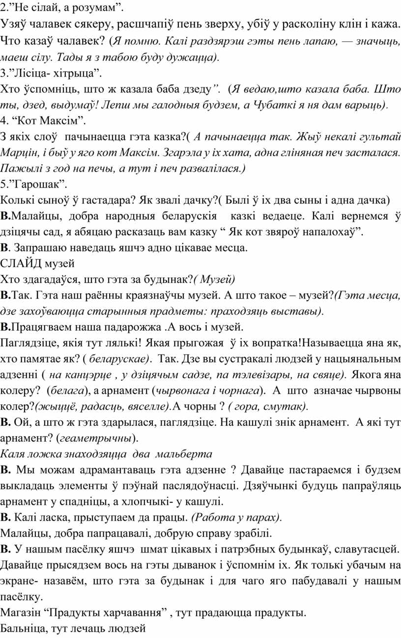 В.Так. Гэта наш раённы краязнаўчы музей. А што такое – музей?(Гэта месца, дзе захоўваюцца старынныя прадметы: праходзяць выставы).