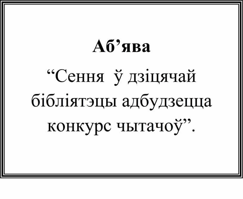 Аб’ява “Сення ў дзіцячай бібліятэцы адбудзецца конкурс чытачоў”.