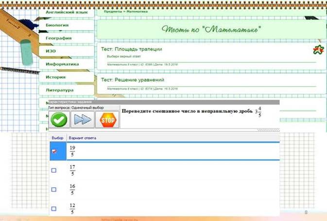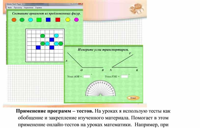 Применение программ – тестов. На уроках я использую тесты как обобщение и закрепление изученного материала. Помогает в этом применение онлайн-тестов на уроках математики. Например, при