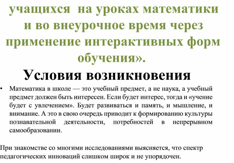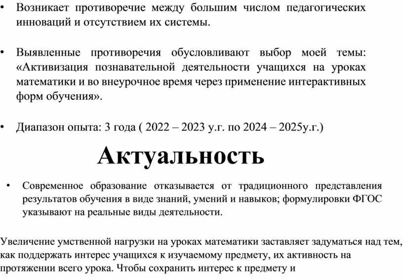 • Выявленные противоречия обусловливают выбор моей темы: «Активизация познавательной деятельности учащихся на уроках математики и во внеурочное время через применение интерактивных форм обучения».