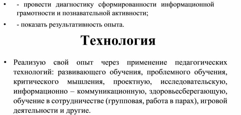 • Реализую свой опыт через применение педагогических технологий: развивающего обучения, проблемного обучения, критического мышления, проектную, исследовательскую, информационно – коммуникационную, здоровьесберегающую, обучение в сотрудничестве (групповая, работа в парах), игровой деятельности и другие.
