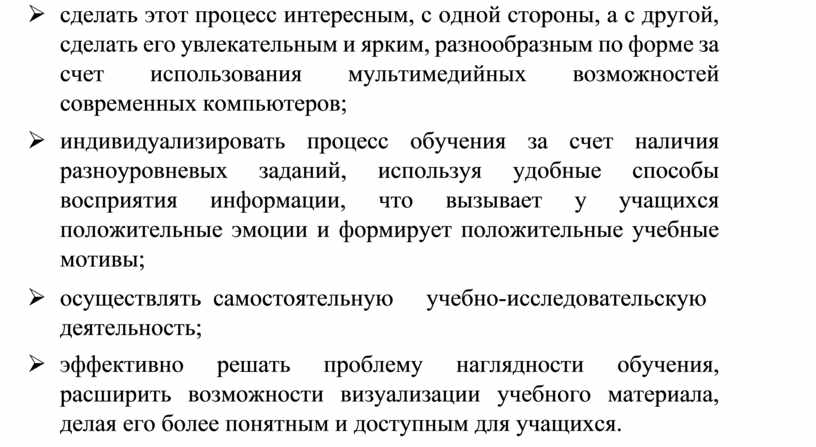 Ø сделать этот процесс интересным, с одной стороны, а с другой, сделать его увлекательным и ярким, разнообразным по форме за счет использования мультимедийных возможностей современных компьютеров;