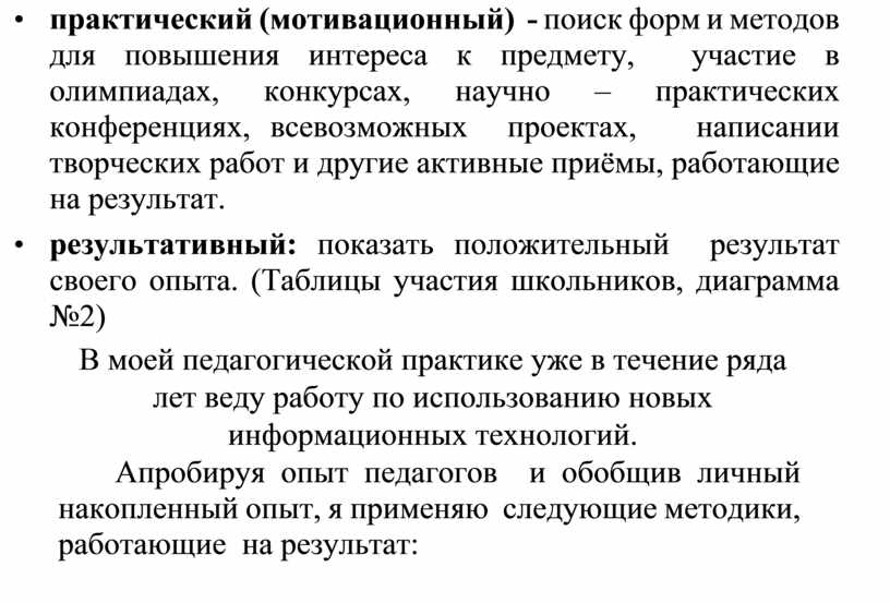 • практический (мотивационный) - поиск форм и методов для повышения интереса к предмету, участие в олимпиадах, конкурсах, научно – практических конференциях, всевозможных проектах, написании творческих работ и другие активные приёмы, работающие на результат.