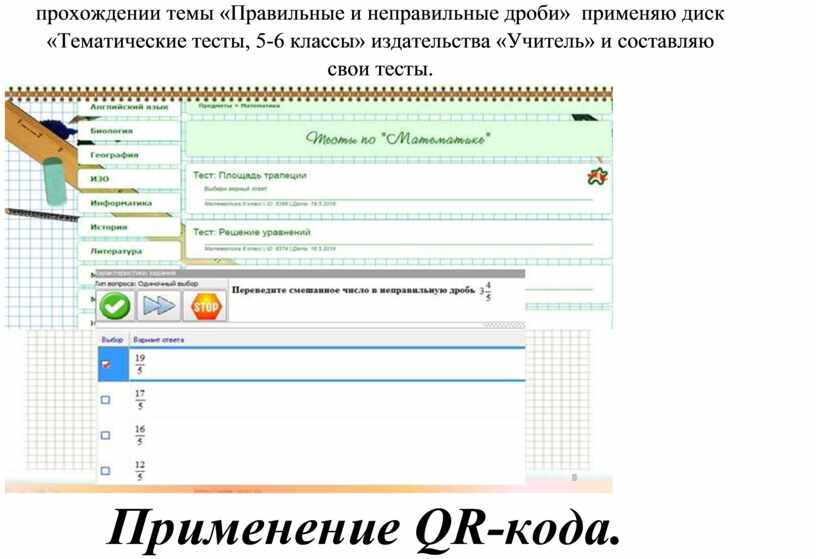 прохождении темы «Правильные и неправильные дроби» применяю диск «Тематические тесты, 5-6 классы» издательства «Учитель» и составляю свои тесты.