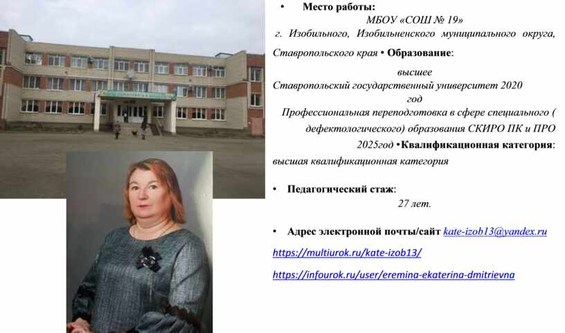 • Адрес электронной почты/сайт kate-izob13@yandex.ru https://multiurok.ru/kate-izob13/ https://infourok.ru/user/eremina-ekaterina-dmitrievna