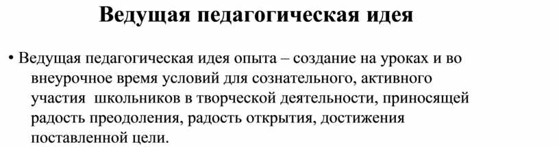 • Ведущая педагогическая идея опыта – создание на уроках и во внеурочное время условий для сознательного, активного участия школьников в творческой деятельности, приносящей радость преодоления, радость открытия, достижения поставленной цели.