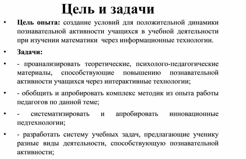 • Цель опыта: создание условий для положительной динамики познавательной активности учащихся в учебной деятельности при изучении математики через информационные технологии.